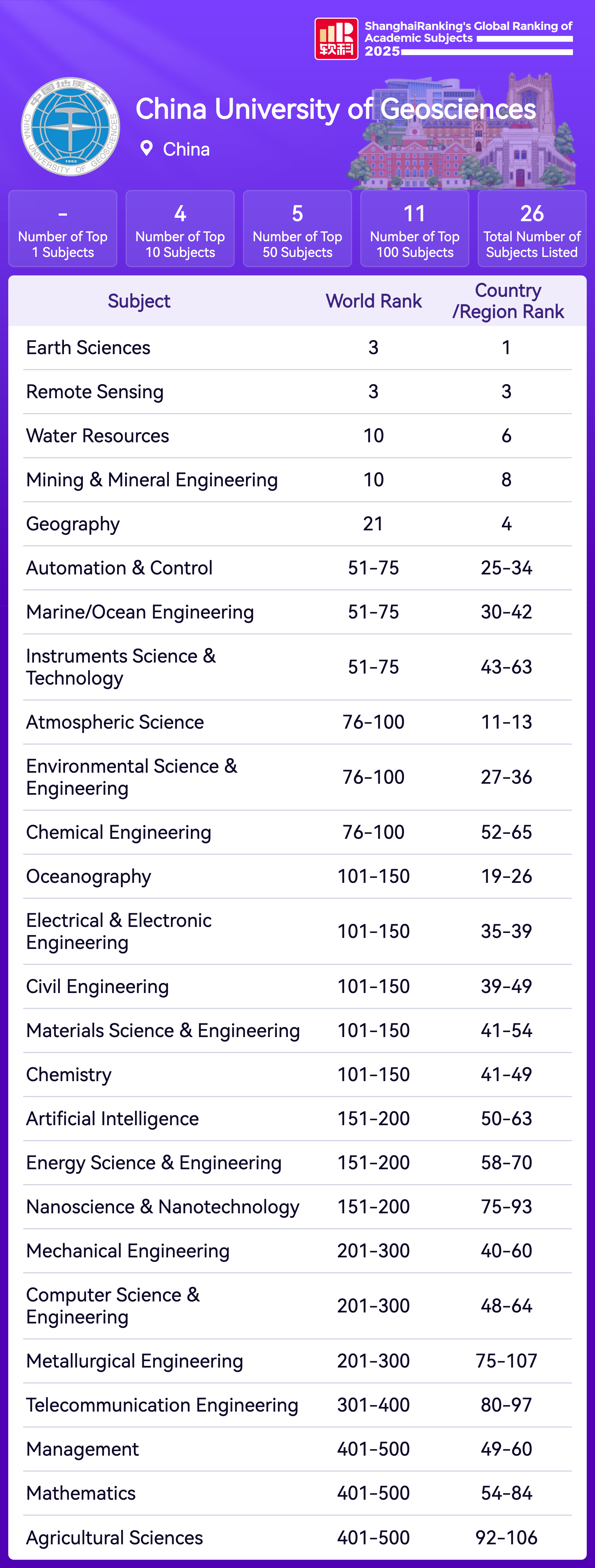 China University of Geosciences (CUG) is a national leading university directly under the administration of the Ministry of Education of P. R. China, and is among the first Universities joining the national “211 Project” which is designed to develop one hundred first-rate universities in the 21st century and in 2006 was also selected as one of the group of pilot universities for the "Platform for National Advanced Disciplines Innovation" program. It was one of the first universities to be entitled to establish state-approved graduate schools. It is renowned for the study of geosciences with 2 national key disciplines: geology,geological resources and geological engineering and at the same time it maintains a balanced program of science, engineering, humanities, management, economics, law, education and philosophy.]CUG(Wuhan) is a member of the National Civilized Units, and one of the best Civilized Units of Hubei Province. CUG takes former Premier Wen Jiabao’s inscription "hard work and plain living, being pragmatic" as its motto(Premier Wen Jiabao is one of the outstanding alumni of CUG ). On the basis of summing up the experience in education and looking to the future development trends, the school sets up its period and long-term goals: constructing high-level university with first-class Earth Sciences and coordinated development of multi-disciplines as the period goal; and constructing a university with world first-class Earth Sciences as its long-term goal. The university insists on stressing its characteristics, perfecting the discipline system, continuously improving the quality of personnel training, and enhancing the scientific and technological ability for innovation, which provides the intellectual supports for the building of a well-off society in an all-round way, and for the building of a resource-conserving and environmentally-friendly society. Now CUG (Wuhan) is proud of its teaching and administrative staff of 3150 people. Among them, there are 405 professors and 478 associate professors including 8 academicians of the Chinese Academy of Sciences, 182 doctoral supervisors, 5 academicians of the Russian Academy of Natural Sciences, 2 of the Russian Academy of Engineering, 5 professors listed in the “National Talents Project”, 9 professors receiving funds from the “Cheung Kong Scholars” program, 9 winners of National Science Fund for Distinguished Young Scholars, and 13 professors receiving funds from the “ChuTian Scholars” program. In the recent 5 years, 2 national innovation research teams,3 Innovative Research Teams from MOE(Ministry of Education),4 Teaching Teams at State-level, 1 national teaching master, 4 teaching masters of Hubei Province have been added, which shows that CUG has made great progress. In 2008, professor Cheng Qiuming, following professor Zhao Pengda (a professor of CUG, academician of the Chinese Academy of Sciences), became the second Asian that won the Karen Penn Award (the highest award of IAMG). Nowadays, CUG has 86 research institutes and laboratories, among which there are 2 national key laboratories, one national engineering laboratory, and 17 provincial or ministerial key laboratories, engineering research centers, humanities and social science research base. The school library has a wealth of literature resources, taking scientific and technical literature as the main body, the Earth science literature as the main features of the collection system. With its more than 1,550,000 paper books and more than 650,000 electronic books and 1500 kinds of periodicals on hand for our students, it is an ideal resource. Besides, teachers and students can easily get access to 20 Database in both Chinese and foreign languages. CUG has a complete personnel training system: Bachelor – Master – Doctor. There are 54,000 students, of which nearly 25,000 full-time students, more than 2,400 part-time professional postgraduate students, 27,000 adult education and online education students, 500 international students. CUG has been vigorously building its Earth Sciences-oriented discipline system, and actively developing the applied science, the frontier science and new interdisciplinary subjects as information technology, nanometer, material science, biology, energy, environmental protection that are closely related to national economic construction and social development. At present, the University has 8 national key disciplines, 13 provincial or ministerial key disciplines, among which two first-class disciplines, namely, geological resources and geological engineering, and geology, rank the first in China respectively. And now there are 17 schools which offer 60 undergraduate programs. In addition, the school has a national geology science personnel training base and a geology engineering personnel training base which is affiliated to the Ministry of Land and Resources. There are 9 post-doctoral research centers in the school. CUG has been given the authority to award doctoral degree in 13 disciplines (first-class) and to award master degree in 38 disciplines (first-class). Besides, the university has the right to award Professional Degrees in Engineering Master, MBA、MPA、MFA、J.M. etc. In the past 60 years, CUG has fostered a large number of outstanding graduates. Among them, Premier Wen Jiabao is the representative of the so many management elites; Ouyang Ziyuan, the chief scientist of the "Chang E Project", is the representative of 29 academicians; Li Jiulin, chief engineer of the national stadium "Bird's Nest", is the representative of a large number of engineering Wizards. The majority of our graduates are on their own efforts to win honor for the school and provide support for the school. And in the meantime, CUG will also make more prominent contributions to solving the sustainable economic and social development issues and seeking harmonious development between mankind and the earth.