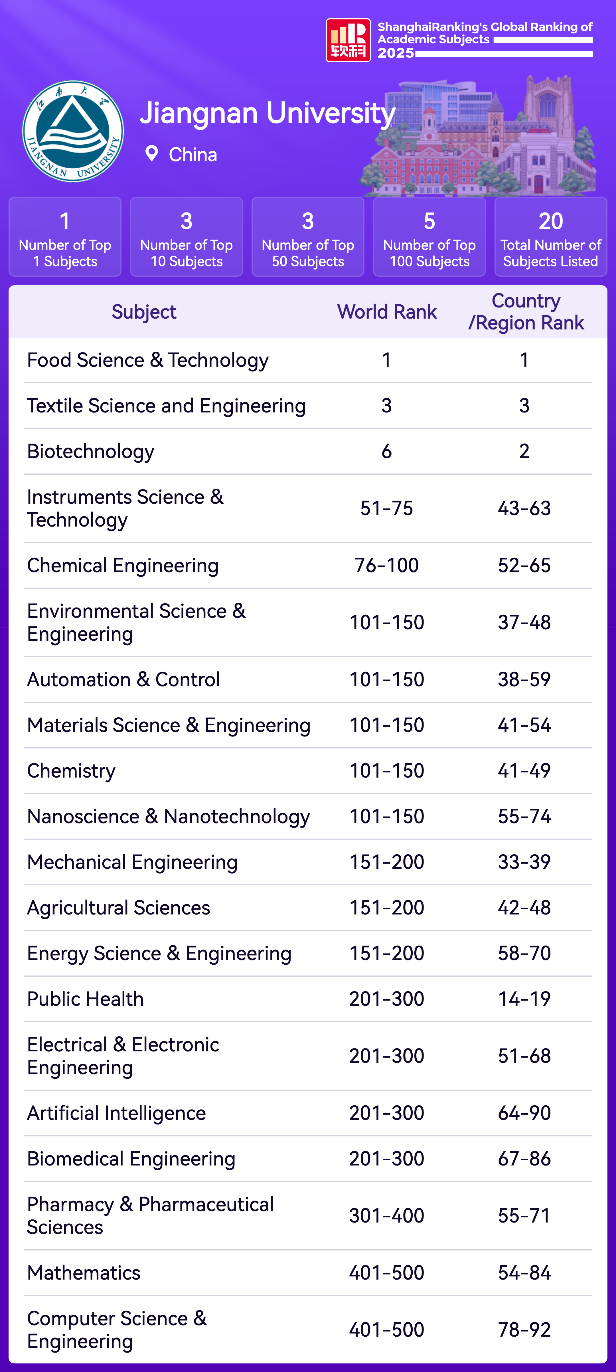 Jiangnan University (JU) functions directly under the Ministry of Education,enjoys a preferential status as both a distinguished national key “211 Project” and "985" platform university. Its roots stretch back to its earliest predecessor, San Jiang Normal School which began in 1902, and it became a part of National Central University (later renamed as Nanjing University). In 1952, the department of Food Industry at Nanjing Institute of Technology (now Southeast University) was established from a combination of several related departments of former National Central University, Fudan University, Wuhan University, Zhejiang University and the original Jiangnan University. In 1958, the department was moved to Wuxi and consequently Wuxi Institute of Light Industry was founded. In 1995 it was renamed as Wuxi University of Light Industry. In 2001, approved by the Ministry of Education, Jiangnan University was formed through a merger of Wuxi University of Light Industry, Jiangnan College and Wuxi Normal College. In 2003, Wuxi Campus of Donghua University was incorporated into JU. Known as the “Pearl of China’s Light Industry Higher Education”, Jiangnan University’s motto is “Learning and Practice to Perfection”. Our objectives are to excel in the field of light industry in order to serve the community, to cultivate talents to become pillars of industry through innovative education, and to build a distinctive research university with distinct features. The campus of Jiangnan University is located at 1800 Lihu Avenue, Wuxi (Jiangsu Province) at the foot of Xuelang Mountain near the scenic Taihu Lake. Designed with the vision to evolve into an “eco-campus”, Lihu Campus was completed in 2005, covering 213 hectares of land in total, 27 hectares of which is covered by water and 107 hectares by buildings. It was awarded the first prize in campus planning by the Ministry of Education and was among the first batch of “Demonstration Colleges for Energy-Saving Renovation” selected by the Ministry of Education and the Ministry of Housing and Urban-Rural Development. Jiangnan University consists of eighteen schools with ten disciplines covering science, engineering, agriculture, medicine, literature, law, economics, management, education and the arts. JU has five post-doctoral research centers, five doctoral degree programs and twenty four master degree programs. JU offers a national key discipline as well as five sub-level national key disciplines. In the third round of national academic discipline assessment, four disciplines were ranked among the top five in each of their respective fields, with Food Science and Engineering defending the first place, Light Industry and Engineering being ranked the second, Designs fourth and Textile Engineering fifth. In addition, four disciplines including Engineering, Agriculture, Biology and Biochemistry, and Chemistry were ranked among the top 1%, according to the latest ESI Global Impact Assessment rankings. Jiangnan University has established eight national scientific research centers including the State Key Lab of Food Science and Technology and the National Engineering Lab of Food Fermentation Technique and Technology. Since the implementation of China’s Eleventh Five-Year Plan, Jiangnan University has undertaken 2150 national, provincial or ministerial projects which include the specially designated “973 Projects”, “863 Projects”. JU also undertakes both National Key Special Projects and National Key Projects in the fields of Science and Technology. JU receives funding for these initiatives from entities such as the National Natural Science Fund, and has won 392 awards at national, provincial or ministerial level including fifteen State Science and Technology Prizes. In addition, the numbers of patent applications for inventions (1392) and granted patents (451) rank high among China’s intuitions of higher learning and in top 3 at the provincial level. The faculty consists of 3,096 members including 1,753 full-time teachers, 788 of which are postgraduate supervisors. Of the faculty, 69% are professors or associate professors, 52% hold doctoral degrees, and 28% have had at least one year of overseas training. Jiangnan University boasts a member of the China Academy of Engineering as well as fourteen faculty members supported by the following programs of “One Thousand Talents”, “1000 Youth Experts” and “1000 Global Experts” from Central Organization Department. JU also has 8 professors getting the honor of “Cheung Kong Scholars”, 3 achieving “Outstanding Young Investigator Award”, 6 selected into “New Century Talents Project”, 1 appointed as the chief scientist of “973 Projects” and 3 supported by “Ten Thousand Talents Project”. The quality of our teaching is highlighted by the success of our researchers: they have won ten national teaching achievement prizes and fifty two provincial teaching achievement prizes. The competition of our students is shown in Challenge Cup for National College Students Contest, and, in recognition of their work, three doctoral candidates won the National Excellent Doctoral Dissertations. In 2014, undergraduate enrollment is implemented in 51 programs. Jiangnan University is committed to the success of our graduates in different areas including securing employment, pursuing further studies, or becoming entrepreneurs. JU has about 80,000 registered students, among which there are approximately 20,000 full-time undergraduates, 7,627 doctoral and master degree candidates and 782 overseas students. The success of our graduates in finding employment (over 95%) and large number of nearly 150,000 alumni (we have established sixty five alumni chapters throughout the world) is giving JU an increasing global reach. Twenty-five percent of graduates also continue with further education. In addition, as one of the first beneficiaries of Jiangsu Entrepreneurship Scheme, JU is contributi