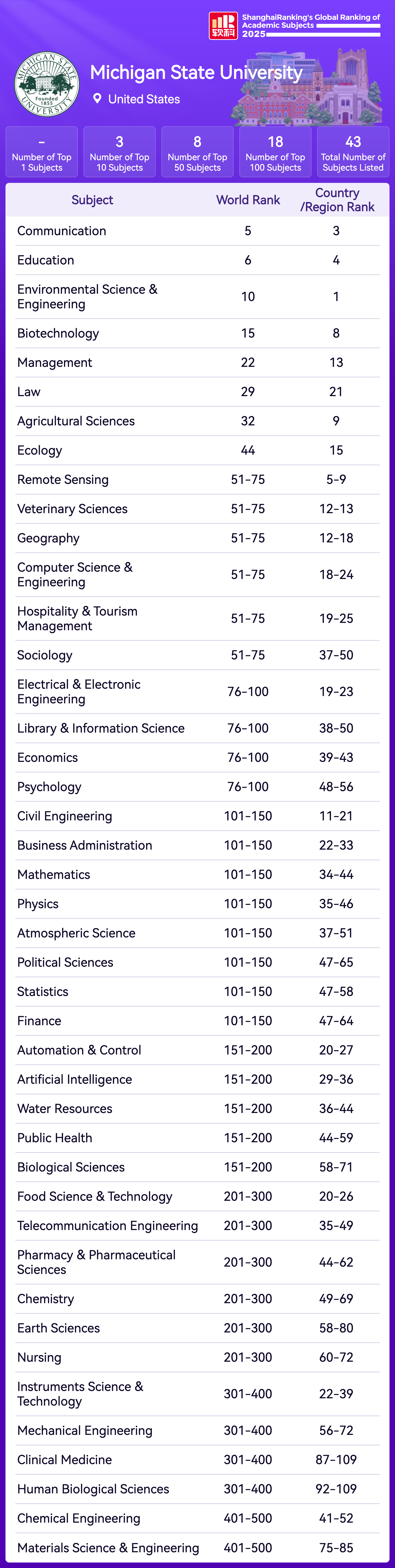 Michigan State University has been advancing the common good with uncommon will for more than 165 years. The nation’s pioneer land-grant university, MSU was founded as a bold experiment that democratized higher education and helped bring science and innovation into everyday life. In communities from East Lansing to East Africa, MSU Spartans push the boundaries of discovery and forge enduring partnerships to create solutions that make a better tomorrow—from ensuring safe food and water supplies and developing lifesaving vaccines to advancing rare isotope research and preparing a new generation of urban educators. One of the top research universities in the world and a member of the Association of American Universities, MSU offers nationally ranked and recognized academic, undergraduate research, residential college, study abroad, and service-learning programs and is the nation’s top public research university for student engagement. A diverse and inclusive academic community, MSU enrolls more than 50,000 students from all 50 states and more than 130 countries, employs 2,000 tenure-system faculty members, and offers more than 200 programs of study in 17 degree-granting colleges.