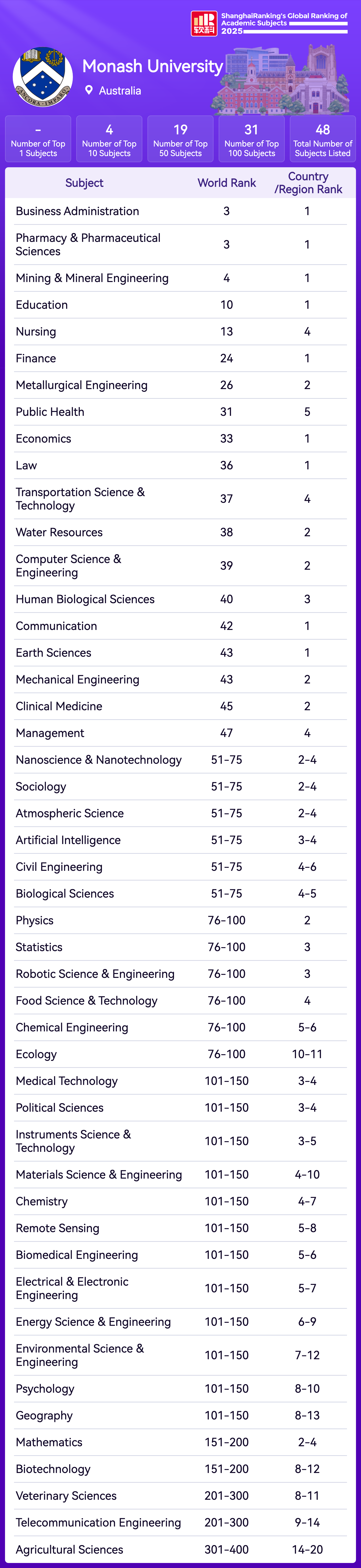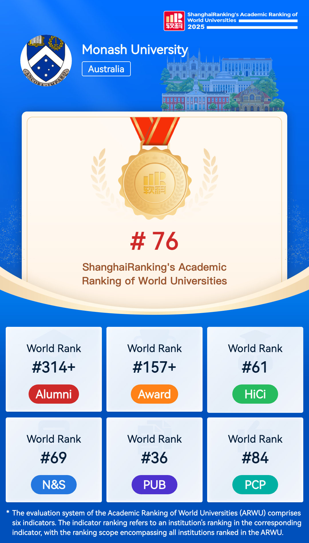 For more than 60 years, we’ve been working hard to change the world. We're tackling climate change, developing new drugs to save millions of lives, using virtual reality to treat addiction, bringing sight to the visually impaired, and so much more. Our work improves health, solves complex global challenges and empowers whole communities. We're working every day to create real, lasting global change and we encourage and challenge our students to be at the forefront of innovating for a better future. Combining world-leading teaching, research, facilities and experiences, Monash University ranks in the world’s top 100 universities. International experience To take on the world you need a truly international outlook. Monash offers students the opportunity to become genuine global thinkers with campuses in Australia, Malaysia, China, India, and Italy. We also offer one of the most extensive international exchange and study tour programs with opportunities available in 100 partnering universities in 30 countries across the globe. Group of Eight Monash University is a founding member of the Group of 8, Australia's leading universities. The breadth of our academic expertise, diversity of the student cohort, size and scale of our alumni network, the campus experience and the on-campus resources all combine to give you a wealth of opportunity and experience. We’re in the world’s top 100 Our reputation for excellence in education and research coupled with our global record of innovation sees Monash University ranked 84 in the world*. Our students are immersed in the highest-calibre learning environment you'll find in Australia Enterprising and boundary-pushing We are continually driving change and improvement and have a proud history of preparing students for careers in the modern world. Integrating work and industry experience comes naturally at Monash. You'll develop practical expertise, leadership, teamwork and entrepreneurial skills. Flexibility and choice When it comes to study, we know that one size does not fit all, so we have a wide range of courses for you to choose from. Whether you have a passion for the arts, are focused on a career in medicine, or want to pursue a career in the global business world, there's a course to suit you. Your journey starts here: monash.edu (*Times Higher Education World University Rankings 2019).