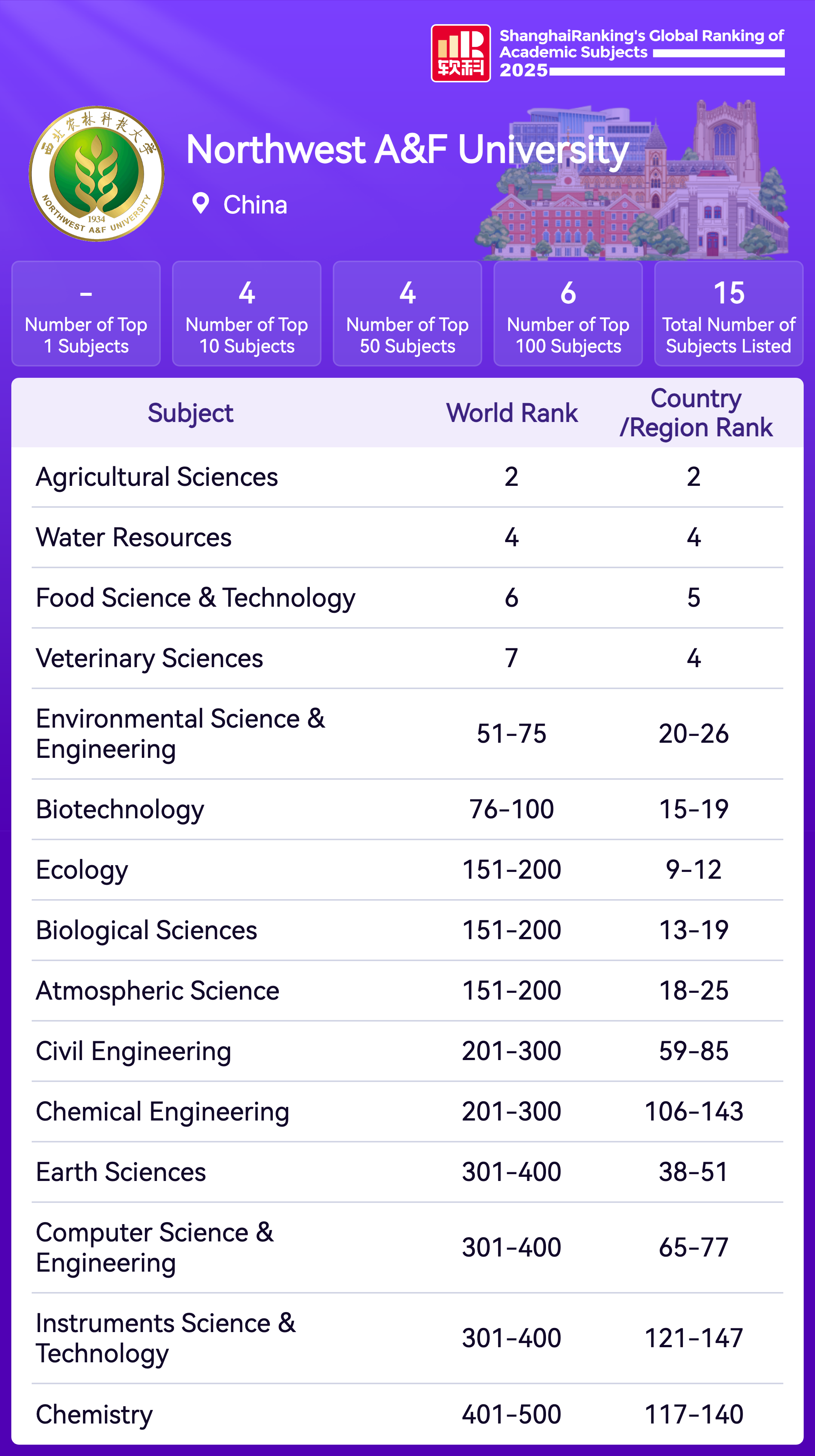 NorthwestA&F University(A&F) is a national key comprehensive university directly under the jurisdiction of Chinese Ministry of Education (MOE). The university is co-administered by Ministry of Education, Ministry of Agriculture, Ministry of Water Resources, State Forestry Administration, Chinese Academy of Sciences, and Shaanxi Province. As one of the leading universities inChina, A&F is supported by Ministry of Education's "Project 985", whose purpose is to build world-class universities inChina. The university is also a member of the "Project 211", a new government endeavor aimed at strengthening 100 institutions of higher education and key disciplinary areas as a national priority for the 21st century. In addition, the university is one of 56 universities authorized to run Graduate Schools inChina. A&F was the first high level institution for modern agricultural education in northwestChina. In addition to its 18 colleges (department), the university also includes Institute of Soil and Water Conservation, and Department of Physical Education. There are 64 undergraduate programs encompassing eleven disciplines in agriculture, science, engineering, economics, management, humanities, law, philosophy, history, medicine and education. There are seven national key disciplines: Plant Pathology, Soil Science, Agricultural Soil and Water Engineering, Clinical Veterinary Medicine, Pomology, Animal Genetics, Breeding, and Reproduction, Agricultural Economics and Management. There are also two state key fostering disciplines: Crop Genetics and Breeding, and Agricultural Entomology and Pest Control. The university has 25 key disciplines at ministerial or provincial levels, one national key laboratory, 15 key laboratories at ministerial or provincial levels, 18 research centers or engineering (technological) research centers, and 4 national field research stations. A&F also has eleven postdoctoral research stations as well as 11 Ph.D. programs and 18 Master's programs in Level I disciplines and 71 PhD. programs and 105 Master's programs in Level II disciplines. The university runs professional master's programs in engineering, agricultural extension, veterinary medicine, and landscape and gardening and on-the-job master's programs for teachers at high level colleges and intermediate vocational schools. The university staff includes accomplished senior professors and researchers together with young innovative academic leaders who are on the cutting edge of their research fields. There are 1,478 full time teachers among the 4689 staff members, including 258 professors and 372 associate professors. Among the teachers, 236 are qualified to supervise doctoral students and 623 are qualified to supervise master's students. Currently the university has one academician of Chinese Academy of Sciences, one academician of Chinese Academy of Engineering, and seven jointly-appointed academicians. A&F faculty members have won a number of titles and awards including 1 chair professor and 1 lecturer professor in the "Cheung Kong Scholars" Program, 4 recipients of "National Outstanding Youth Fund", 11 award winners in the "National Hundred-Thousand-Ten-Thousand Talent Project", 1 winner of "Trans-Century Training Program Foundation for the Talents" by MOE, 28 scholars in the " Program for New Century Excellent Talents in University ", 3 winners of the "Award for Young Teachers at Higher Education Institutions", and 13 recipients in the "Excellent Young Teachers’ Program, MOE". A&F began recruiting undergraduate students in 1936 and post-graduate students in 1941. A complete range of study programs is now available at the university for undergraduates, masters, Ph.D. and post-doctoral studies. Technical training courses and adult education are also offered. There are currently over 20,000 full-time undergraduate students, 7100 postgraduates including 5573 postgraduate students for academic degrees, and about 8000 adult education students enrolled at the university. From its beginning, more than 5,000 studies have been completed. A total of 1,800 studies have received awards, including 104 national awards. Outstanding research accomplishments include the development and release of “Bima-1”, the most widely planted wheat variety inChina, and “Xiaoyan-6”, the leading replacement variety. The university researchers also developed the apple variety “Qinguan”, the most commonly planted apple variety inChina. The direct economic benefit of these advances amounts to over 200 billion yuan. Northwest A&F University is actively striving to expand international cooperation and exchange in education, science and technology. The university currently has cooperative relations with over 50 universities and research institutes from theU.S.,U.K.,Japan, andAustralia, etc. In 2006, the university received approval to recruit international students who are funded by scholarships from Chinese government.