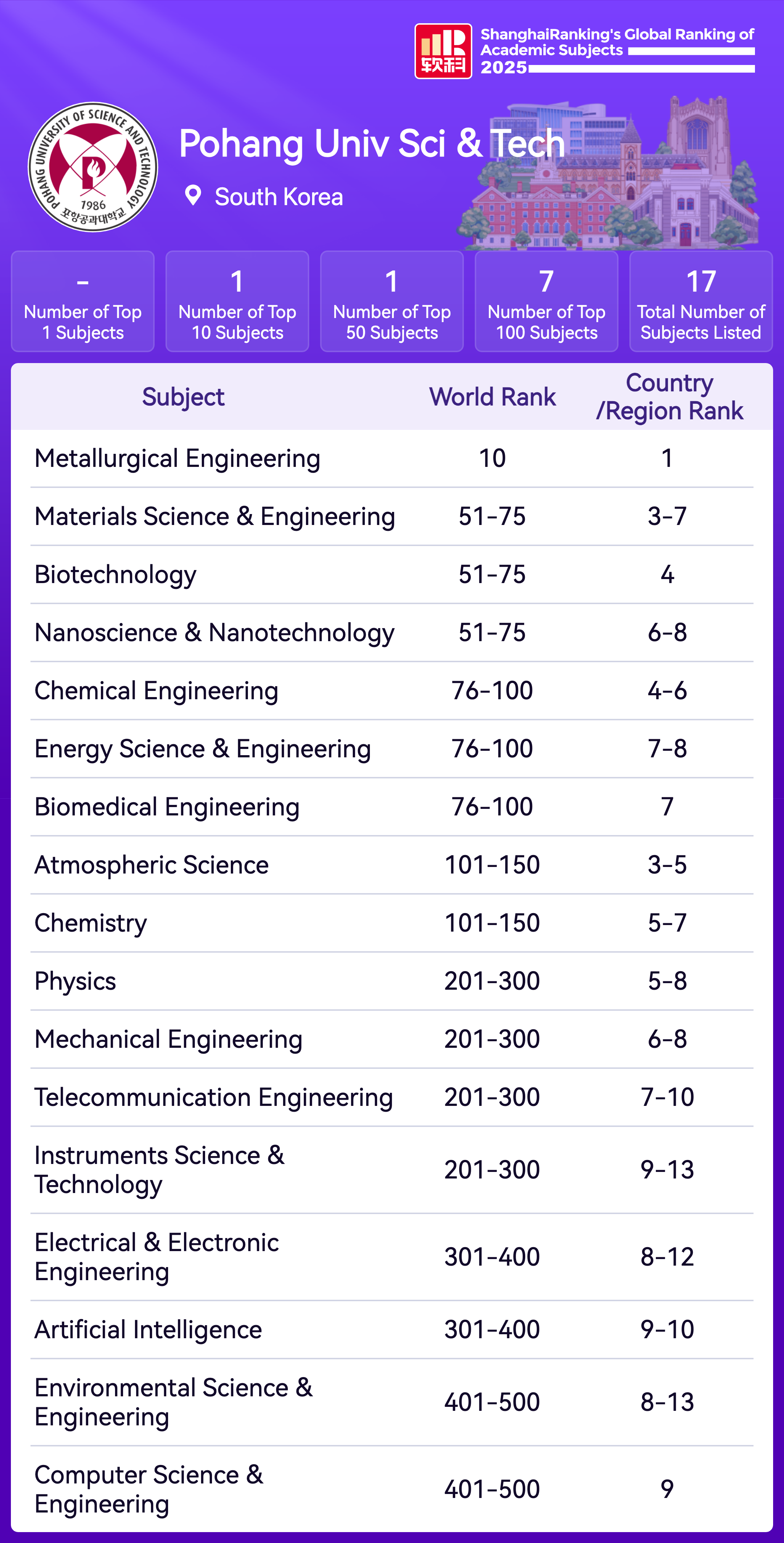 Ever since its establishment in 1986, POSTECH has stayed true to its role in Korean higher education as a pioneer in science and technology research. Located in the city of Pohang, the 400-acre, park-like campus is home to the Pohang Accelerator Laboratory and minutes away from POSCO, the fourth-largest steelmaking company in the world. POSTECH has come a long way in its short history to become globally recognized as one of Asia's premier universities and among the most selective, highly ranked research universities in Korea. The founding principle behind POSTECH's establishment lies in providing a student-centered education in a highly collaborative and intimate academic community. The university is made up of 11 departments and 22 graduate programs. POSTECH's student-to-faculty ratio is 6:1, allowing students to work closely with our outstanding and award-winning faculty. POSTECH provides the highest educational investment and the most per-student scholarship support in Korea, allowing talented students from all economic backgrounds the opportunity to obtain a POSTECH education. Maximization of the university's research capabilities has always been the utmost priority of POSTECH. Home to 64 research centers, POSTECH offers many state-of-the-art research facilities, including Korea's only synchrotron radiation facility. Support on all levels ranging from infrastructure to management and finances have resulted in many distinguished research achievements. In 2012, POSTECH was ranked first in the Times Higher Education's "100 under 50" which lists the top 100 universities in the world under 50 years old. POSTECH is guided by the university's motto of Integrity, Creativity, and Aspiration as it strives to become a top 20 world university by the year 2020.