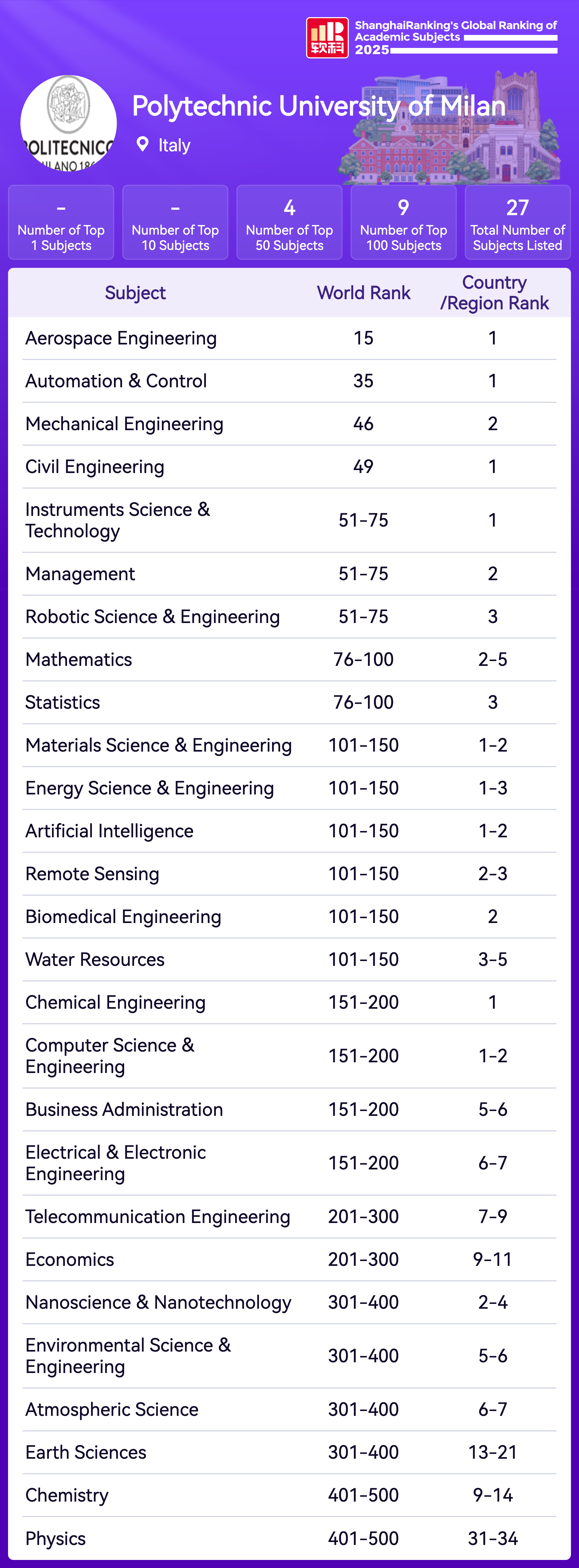 Politecnico Milano is a scientific-technological university which trains engineers, architects and industrial designers. The University has always focused on the quality and innovation of its teaching and research, developing a fruitful relationship with business and productive world by means of experimental research and technological transfer. Research has always been linked to didactics and it is a priority commitment which has allowed Politecnico Milano to achieve high quality results at an international level as to join the university to the business world. Research constitutes a parallel path to that formed by cooperation and alliances with the industrial system. Knowing the world in which you are going to work is a vital requirement for training students. By referring back to the needs of the industrial world and public administration, research is facilitated in following new paths and dealing with the need for constant and rapid innovation. The alliance with the industrial world, in many cases favored by Fondazione Politecnico and by consortiums to which Politecnico belong, allows the university to follow the vocation of the territories in which it operates and to be a stimulus for their development. The challenge which is being met today projects this tradition which is strongly rooted in the territory beyond the borders of the country, in a relationship which is developing first of all at the European level with the objective of contributing to the creation of a single professional training market. Politecnico takes part in several research, sites and training projects collaborating with the most qualified European universities. Politecnico's contribution is increasingly being extended to other countries: from North America to Southeast Asia to Eastern Europe. Today the drive to internationalization sees Politecnico Milano taking part into the European and world network of leading technical universities and it offers several courses beside many which are entirely taught in English.