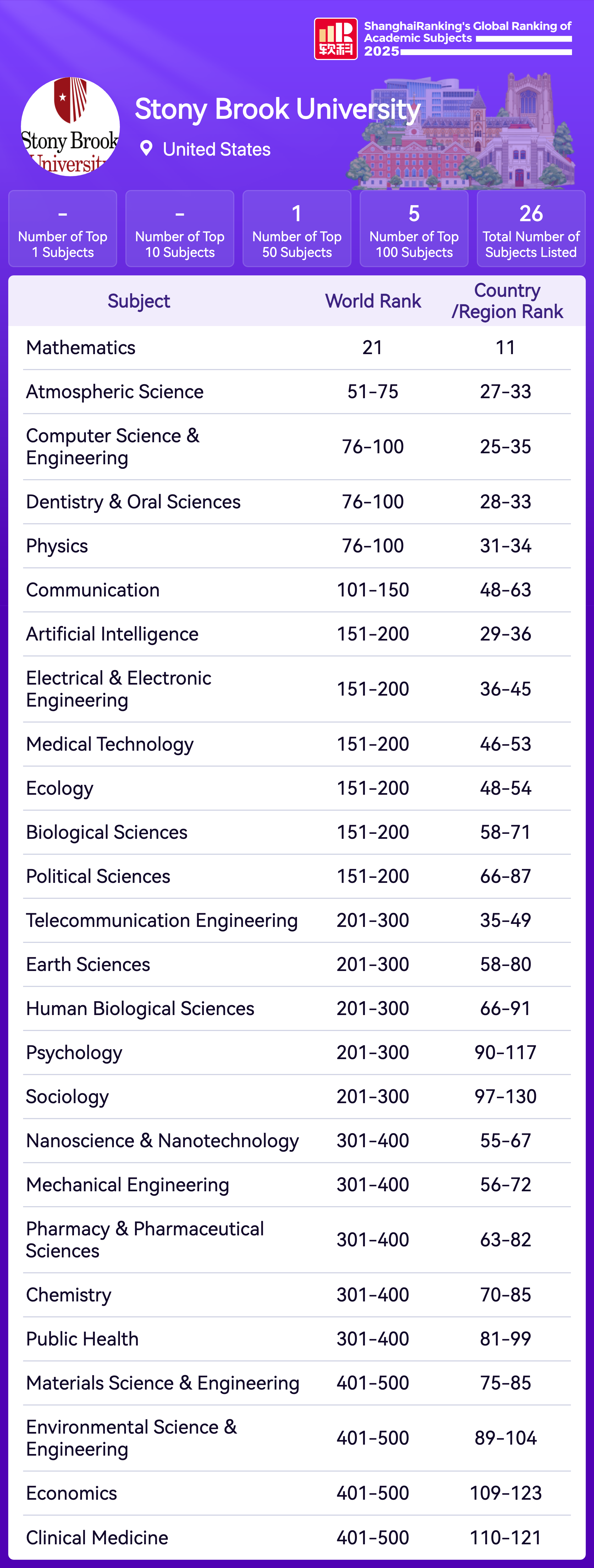 Stony Brook University is one of America’s most dynamic public universities and a magnet for outstanding students. A member of the prestigious Association of American Universities, Stony Brook is one of the 65 top research institutions in North America, with more than $190 million in annual sponsored research (FY21) and more than 2,300 research projects. Stony Brook faculty are leaders in significant national and worldwide projects, including restoring the water quality and fisheries of Long Island’s Shinnecock Bay, searching for the origins of man in Kenya’s Turkana Basin and managing the national parks of Madagascar. They have made significant contributions to NASA initiatives, such as examining Martian minerals for evidence of life and other phenomena, and their work has led to such groundbreaking discoveries, including a new species of mouse lemur, the smallest primate in the world; the cause of Lyme disease; and the invention of the MRI technology that won the Nobel Prize for Medicine. Since the university’s founding in 1957, Stony Brook’s faculty have received international and national recognition for their achievements. They have won Nobel, MacArthur Foundation, Pulitzer and Abel prizes; National Medals of Science; National Medals of Technology and Innovation; National Inventors Hall of Fame Awards; Guggenheim Fellowships; Wolf Prizes in Mathematics and in Physics; Fields Medals; the inaugural Breakthrough Prize in Mathematics; and the Indianapolis Award for animal conservation. Stony Brook’s faculty includes National Academy of Sciences Fellows, Royal Society Fellows, American Association for the Advancement of Science Fellows, Sloan Fellows, American Academy of Arts and Sciences Fellows, National Academy of Engineering members, National Academy of Medicine members and Pew Scholars. Stony Brook offers more than 200 undergraduate programs, nearly 100 master’s programs and more than 50 doctoral programs, residing in 12 colleges and schools: College of Arts and Sciences, College of Business, College of Engineering and Applied Sciences, Graduate School, School of Dental Medicine, School of Health Professions, School of Communication and Journalism, School of Marine and Atmospheric Sciences, School of Nursing, Renaissance School of Medicine, School of Professional Development and School of Social Welfare. The university’s clinical psychology, geometry and nuclear physics programs have been ranked in the top 10 graduate programs nationwide. The College of Engineering and Applied Sciences offers nine ABET-accredited programs. The School of Marine and Atmospheric Sciences features waterfront learning at Stony Brook Southampton’s Marine Sciences Center. And Stony Brook’s study abroad programs provide unique learning opportunities in countries around the globe, including Australia, Italy, Jamaica, Madagascar. Stony Brook’s diverse student body includes more than 17,500 undergraduates and more than 8,200 graduate and professional students from nearly all 50 U.S. states and more than 100 countries. It has a large international student population and has been a particularly attractive option for students from China, India, South Korea and Taiwan. Stony Brook is a highly selective institution that enrolls students who demonstrate the intellectual curiosity and academic ability to succeed. Opportunities for first-rate graduate and undergraduate research abound. The Laufer Center for Physical and Quantitative Biology seeks to advance biology and medicine through discoveries in physics, mathematics and computational science. The C.N. Yang Institute for Theoretical Physics, founded by Nobel Prize-winning physicist and Stony Brook Professor Emeritus Chen Ning Yang, is a leading center for high-energy physics, string theory and statistical mechanics. Stony Brook students are offered cutting-edge research opportunities at nearby Brookhaven National Laboratory (BNL), which the university has a role in running. BNL facilities include the Relativistic Heavy Ion Collider, Center for Functional Nanomaterials, National Synchrotron Light Source II, NASA Space Radiation Laboratory, Accelerator Test Facility and the Computational Science Initiative. The laboratory’s nearly 2,500 scientists, engineers and staff are joined every year by more than 5,000 visiting researchers from around the world. BNL research has been honored by seven Nobel Prizes. Researchers from around the world also gather at the university’s Simons Center for Geometry and Physics, where they explore synergies between theoretical physics and mathematics to deepen an understanding of the physical universe. The university’s state-of-the-art facilities are integral to its research endeavors: They include the Medical and Research Translation (MART) building, an environment for researchers and doctors to collaborate, investigate and innovate in developing breakthrough cancer medicines, treatments and cures; the Center of Excellence in Wireless and Information Technology, a test bed for emerging wireless technologies; and the Advanced Energy Research and Technology Center, where researchers develop technologies to produce clean energy. Upcoming campus projects include a new engineering building, which will serve as the intellectual hub to enable a technology-driven future, and the Institute for Engineering-Driven Medicine, which explores the convergence of engineering and medicine to transform healthcare. The entrepreneurial energy and economic strength of the university bring a combined benefit of nearly $7.2 billion to the region’s economy. The university is the largest single-site employer in the region, with nearly 16,000 employees. Through its high-technology incubators, the university has promoted the launch of more than 150 companies since 2016. Stony Brook Medicine, the region’s premier academic health center, encompasses Stony Brook University Hospital, the region’s only Regional Trauma Center; Stony Bro