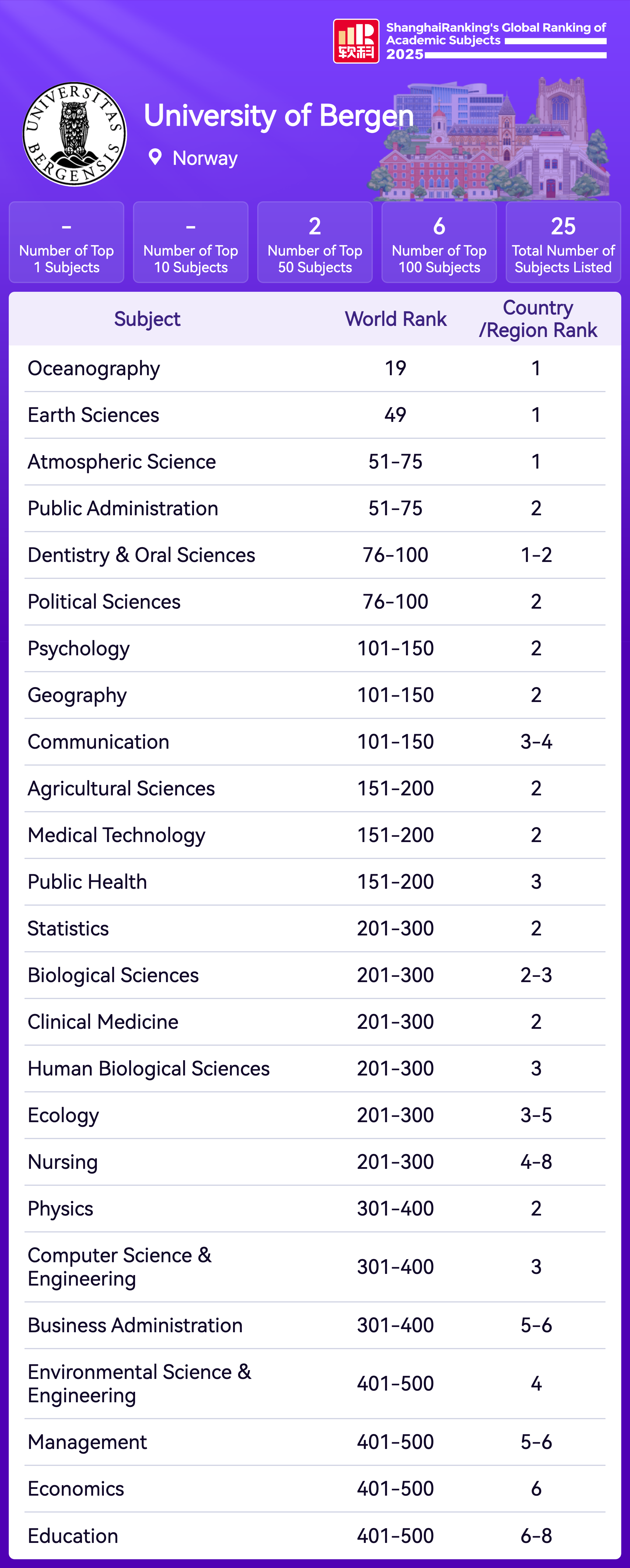 University of Bergen (UiB) is situated on the Western Coast of Norway. Bergen is a 280,000 people city; UiB having 17,500 students approx 2,000 international students and 4,000 staff (2018). UiB is partly situated in downtown Bergen on "the university hill", and partly 4 km outside. UiB has six faculties, with strong fields in marine science, climate research and social sciences. UiB offers some 80 programmes for undergraduates and about 100 Master's, professional and PhD programmes, several taught in English.