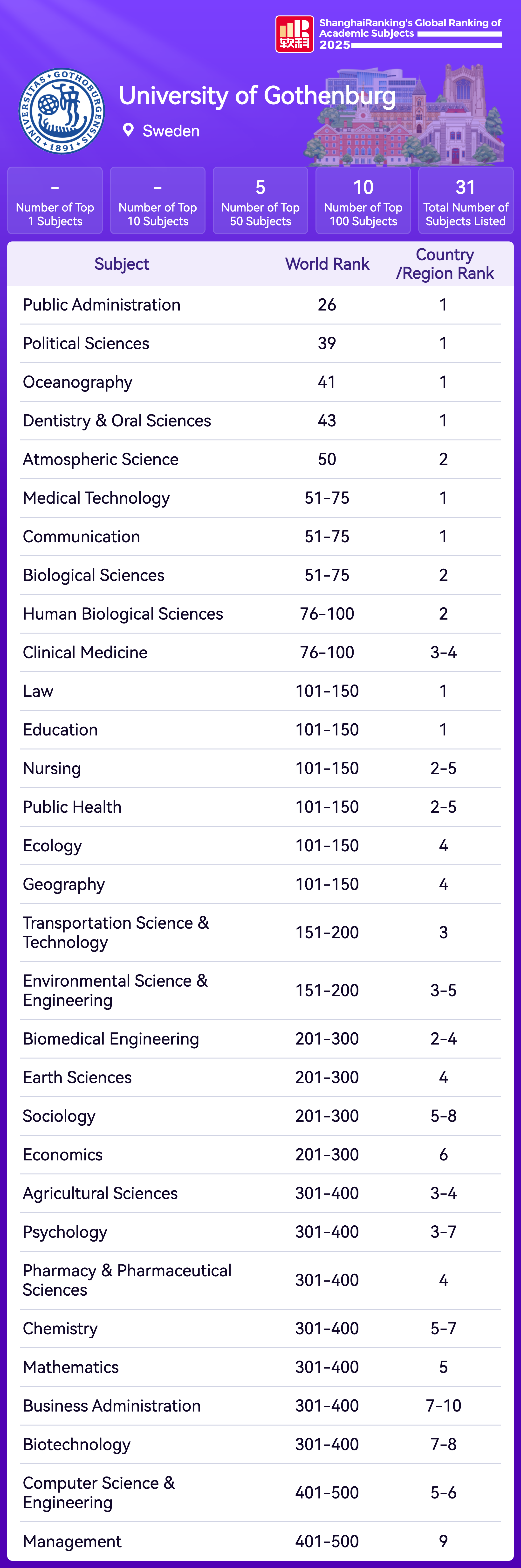University of Gothenburg is one of the major universities in Europe, with about 37 000 full-time students and a staff of 5 300. Its eight faculties offer training in the Creative Arts, Social Sciences, Natural Sciences, Humanities, Education, Information Technology, Business, Economics and Law, and Health Sciences. The University’s unique breadth in teaching and research provides an interdisciplinary environment conducive to collaboration with private enterprise and public institutions. Undergraduate education and research work are intimately linked, and students at all levels have the opportunity to meet scholars of world renown. The quality of the University’s research is widely recognized; we were, for example, honoured with a Nobel Prize in Medicine in 2000. Our central location in Gothenburg facilitates frequent interaction with the world at large. We play an active role in Sweden’s development towards environmental sustainability.