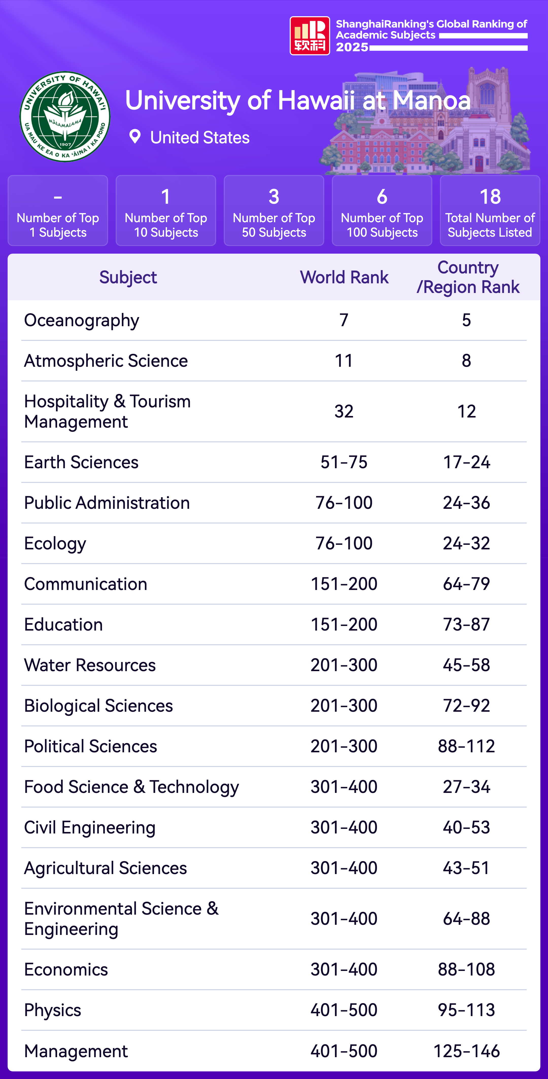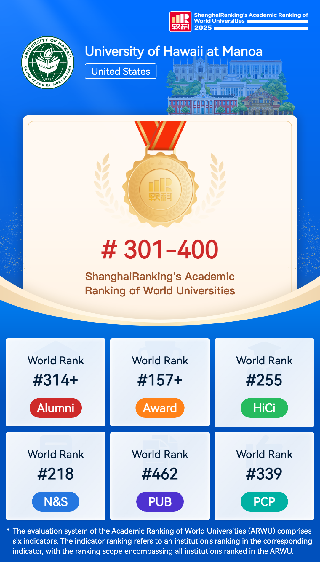 University of Hawai'i at Manoa (UH Manoa) is a research university of international standing. It creates, refines, disseminates, and perpetuates human knowledge; offers a comprehensive array of undergraduate, graduate, and professional degrees through the doctoral level, including law and medicine; carries out advanced research; and extends services to the community. Students have special opportunities for Asian, Pacific, and Hawaiian educational experiences and involvement in research activities, service learning, and co-curricular activities. UH Manoa has widely recognized strengths in tropical agriculture, tropical medicine, oceanography, astronomy, electrical engineering, volcanology, evolutionary biology, comparative philosophy, comparative religion, Hawaiian studies, Asian studies, Pacific Islands studies, and Asian and Pacific region public health. UH Manoa offers instruction in more languages than any U.S. institution outside the Department of State. The main UH campus located in Manoa valley on the island of O'ahu began in 1907 as a land-grant college of agriculture and mechanic arts. With the addition of a College of Arts and Sciences in 1920, the college became the University of Hawai'i. In 1972, it became UH Manoa to distinguish it from the other units in the growing UH system. Today, 20,000-plus students are enrolled in UH Manoa courses, on campus or via distance delivery, studying toward bachelor's degrees in 100 fields of study, master's degrees in 85, doctorates in 58, first professional degrees in architecture, law, and medicine, and a total of 62 undergraduate and graduate certificates. UH Manoa also offers 5 post-baccalaureate certificates. There are 298 degrees and certificates offered. In addition, 72.5 percent of UH Manoa students are undergraduates, 55.8 percent are women, and 74 percent attend school full-time. The mean age of students is 25. The beauty of Manoa valley serves as a backdrop for a unique yet inviting campus. Wander through the campus and find an authentic Japanese tea house and garden located on East-West Center grounds, a studies center that is a replica of a Korean king's throne hall, and a Hawaiian taro patch. Other structures include the Pacific Ocean Science and Technology building on campus and a privately donated marine biology facility on Coconut Island. UH Manoa is accredited by the Accrediting Commission for Senior Colleges and Universities of the Western Association of Schools and Colleges. Professional programs are individually accredited by appropriate agencies. A popular campus symbol is the rainbow, a frequent sight in Manoa valley. Green and white are UH Manoa's colors.