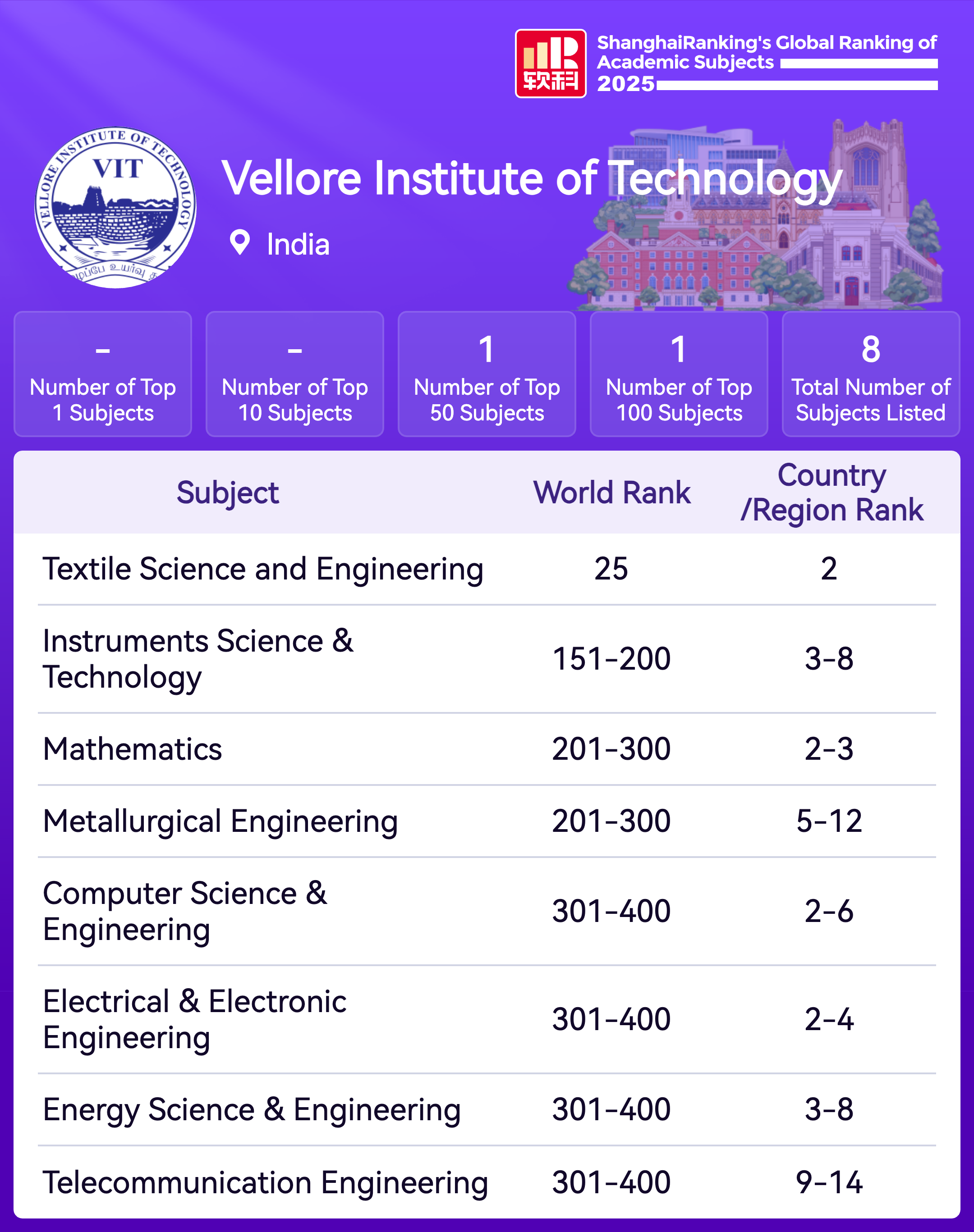 Vellore Institute of Technology (VIT), Vellore was established in 1984 as Vellore Engineering College, with 180 students and 3 programs. Today it has evolved in to a deemed to be University with over 40,000 students offering 42 Undergraduate and 48 Postgraduate programs and having 17 schools in two campuses. VIT is focussed on providing quality education and is engaged in transformative research. It offers bachelors, masters and doctoral level programs in diverse areas including Science, Engineering, Humanities, Life Sciences, Agriculture, Law, Fashion, Architecture, Hospitality, Design and Management. VIT has established 19 research centres, 11 in Vellore and 8 in Chennai, in almost all frontier areas including Biotechnology, Nano technology, Climate change and Data Science. VIT has grown as a leading Educational Institution in India. National Assessment and Accreditation Council (NAAC) has accredited VIT Vellore with CGPA of 3.66 on four-point scale at A++ grade. VIT Vellore has been ranked among the Top 20 Universities in the country consecutively since 2016 by National Institutional Ranking Framework (NIRF), Government of India. In NIRF 2023 VIT is ranked at 8 under University category, at 11 under Research, 11 under Engineering and at 17 in the Overall category. VIT is also ranked high globally. The engineering programs of the Institute are ranked at 240 globally by QS subject ranking 2023. In QS World University Rankings 2024 the University is Ranked within 851-900. In Shanghai Ranking of World Universities 2023 of VIT Vellore is within 701-800. 58 Professors of VIT are among the Top 2% Scientists in the world according to the study conducted by the Stanford University, USA in 2023. VIT is strongly committed to the development of the community and society at large and these initiatives are taken up through the Centre for Sustainable Rural Development & Research Studies. VIT is one among the 20 institutions of India, Identified by Ministry of Education (MoE), Government of India as “Institution of Eminence” and accordingly a letter of Intent was issued by the MoE.